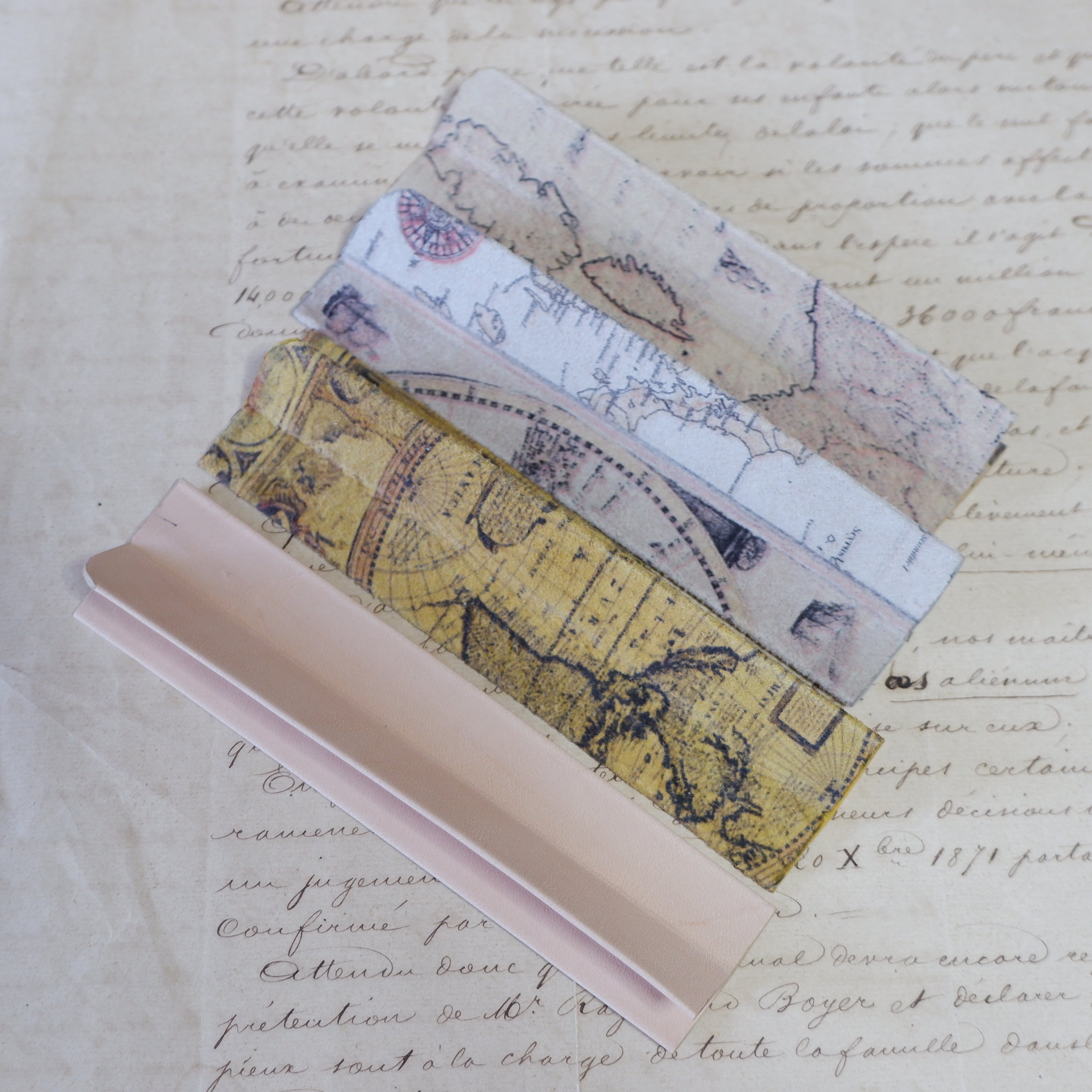 地図柄のピッグスエードを用いたものと、国産牛ヌメ革のものと3タイプございます。