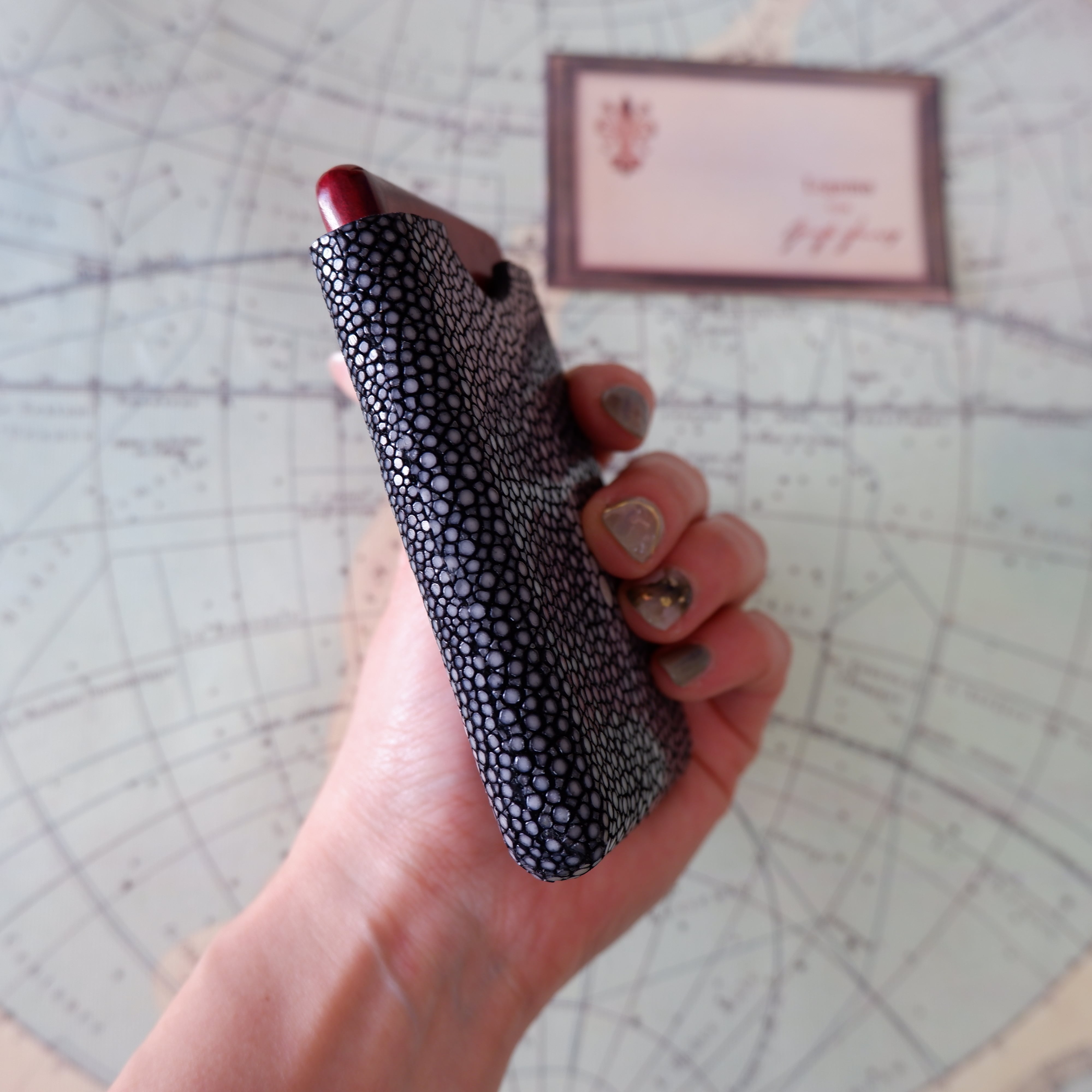 その強度から、昔は武器の一部にも使われていたというエイ革。その個性的な模様と質感が美しく、「海の宝石」とも呼ばれる素材です。