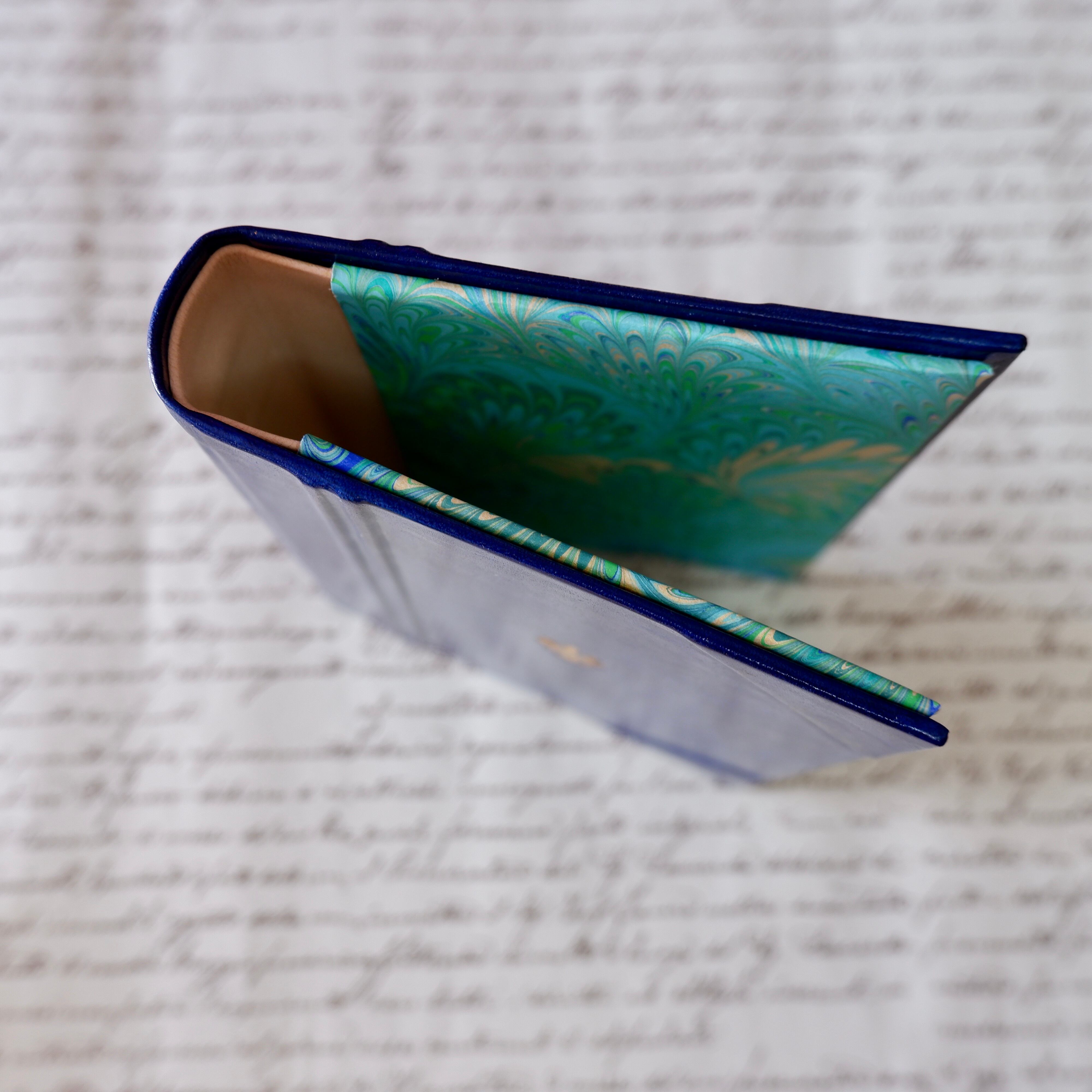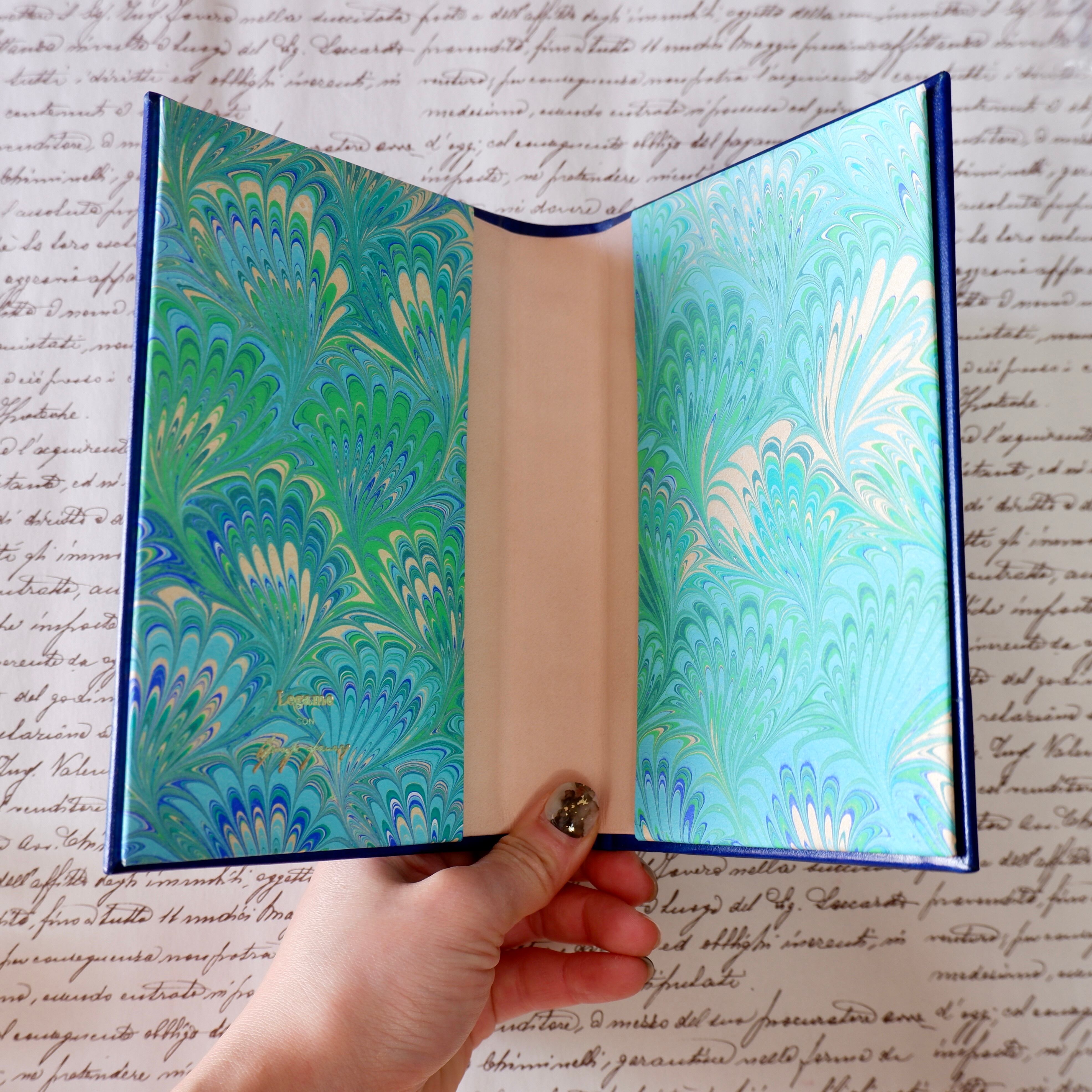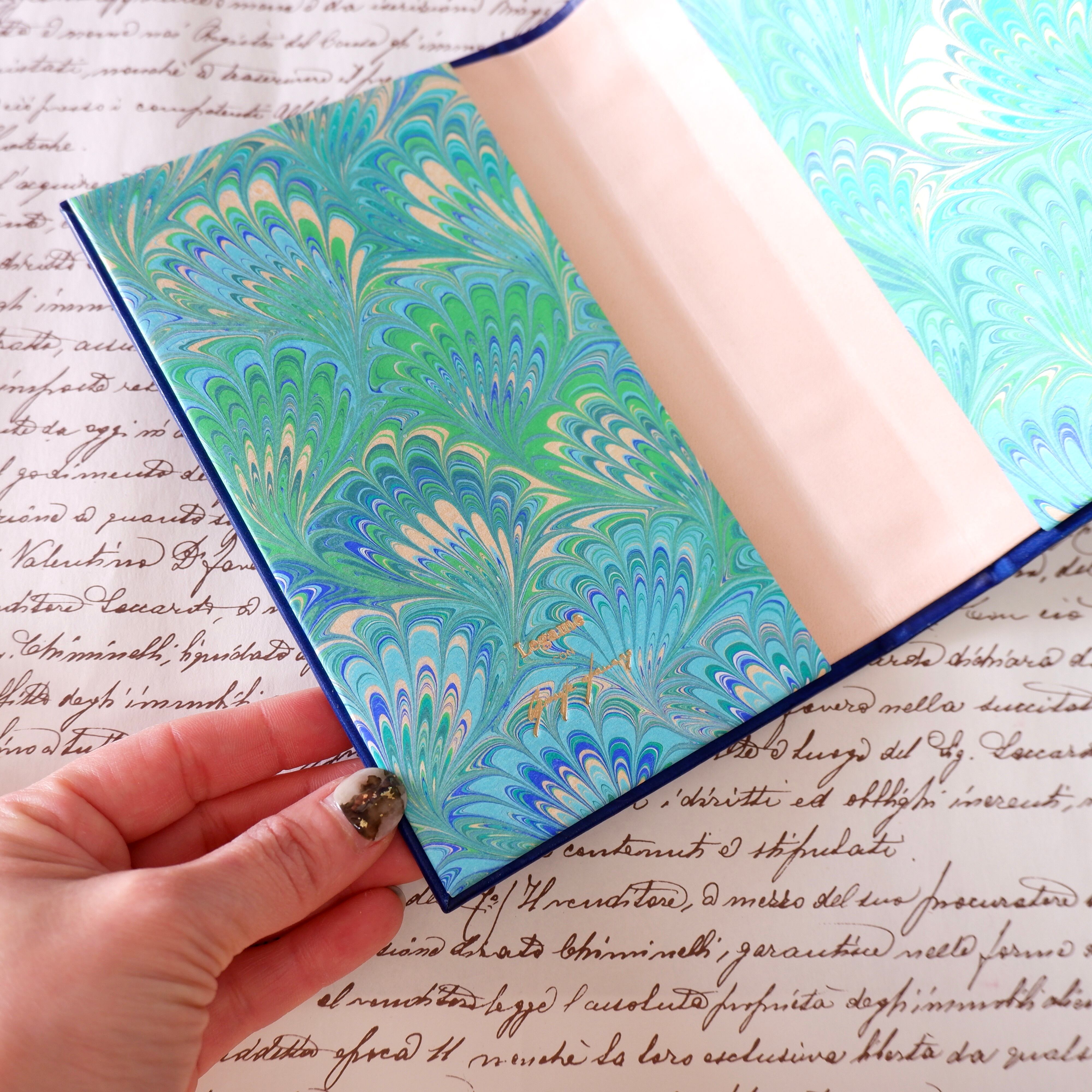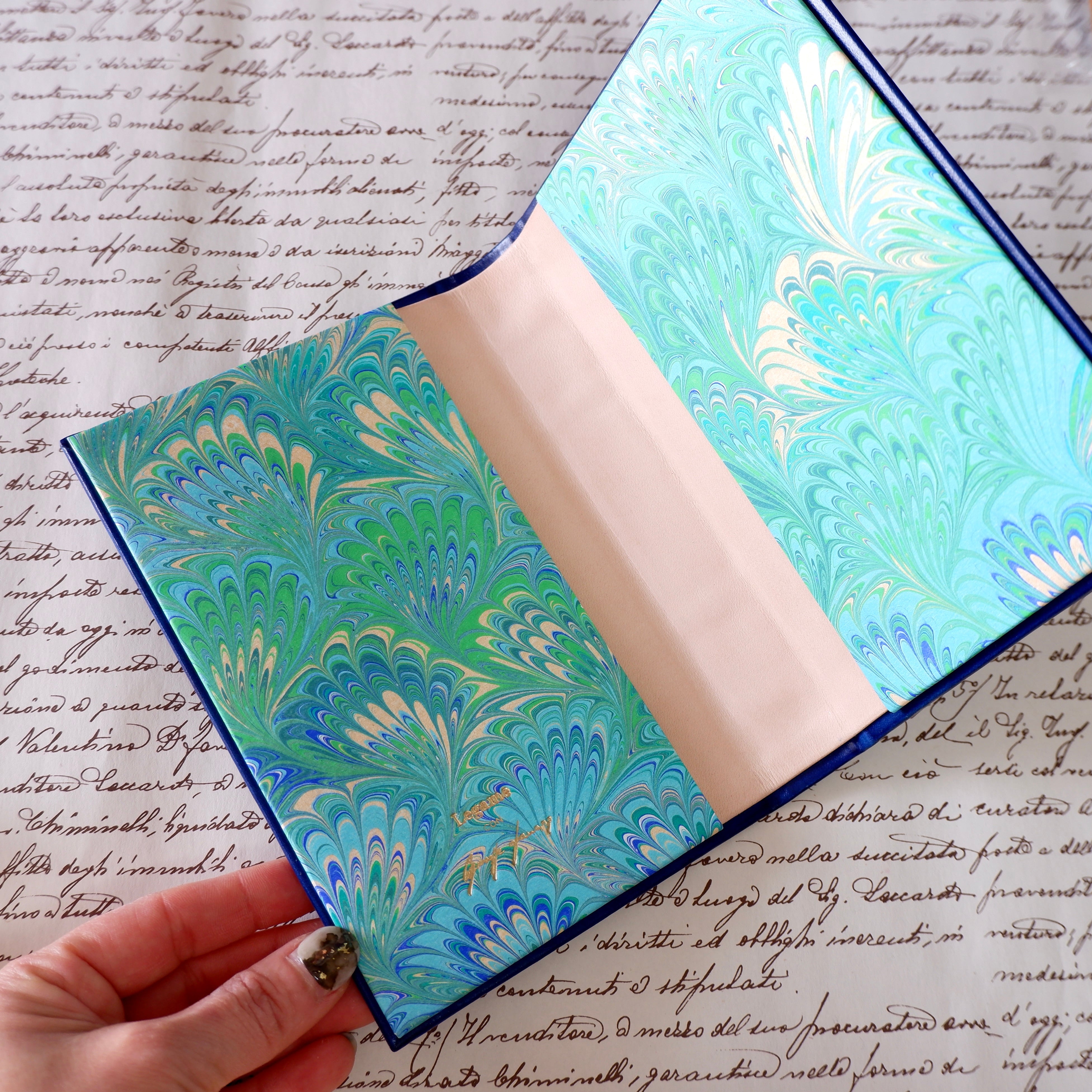 こちらの紙は、フィレンツェの伝統工芸であるマーブル紙。鮮やかなグリーンやブルーのお色味がとても美しいです。